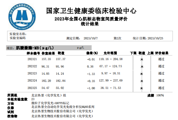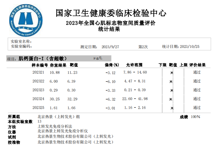 近日,國家衛(wèi)生健康委臨床檢驗(yàn)中心(NCCL)公布了2023年第二次全國臨床檢驗(yàn)室間質(zhì)量評價(jià)結(jié)果。經(jīng)了解,熱景生物心肌標(biāo)志物(肌酸激酶同工酶、肌紅蛋白、肌鈣蛋白I)、血清降鈣素原項(xiàng)目的上轉(zhuǎn)發(fā)光及化學(xué)發(fā)光兩大平臺(tái)產(chǎn)品,以及D-二聚體、白介素6、胃蛋白酶原項(xiàng)目的化學(xué)發(fā)光平臺(tái)產(chǎn)品均滿分通過此次室間質(zhì)量評價(jià)。同時(shí),熱景生物參與的上海臨床檢驗(yàn)中心2023年第二次能力驗(yàn)證活動(dòng),包括AFP異質(zhì)體比率、B型鈉尿肽/N末端B型鈉尿肽前體、心肌標(biāo)志物(肌酸激酶同工酶、肌紅蛋白、肌鈣蛋白I)、血清降鈣素原等項(xiàng)目在內(nèi)的產(chǎn)品均通過評價(jià)。