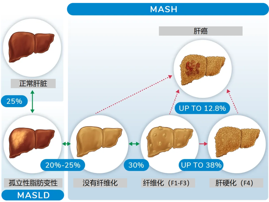 MASLD疾病譜包括單純性脂肪肝(MAFL)、脂肪性肝炎(MASH)及其相關纖維化和肝硬化。隨著肥胖和2型糖尿?。═2DM)的流行,全球MASLD患病率和發(fā)病率不斷增高。據(jù)報道,全球MASLD的發(fā)病率約20-35%,其中約10-30%的患者患有MASH。