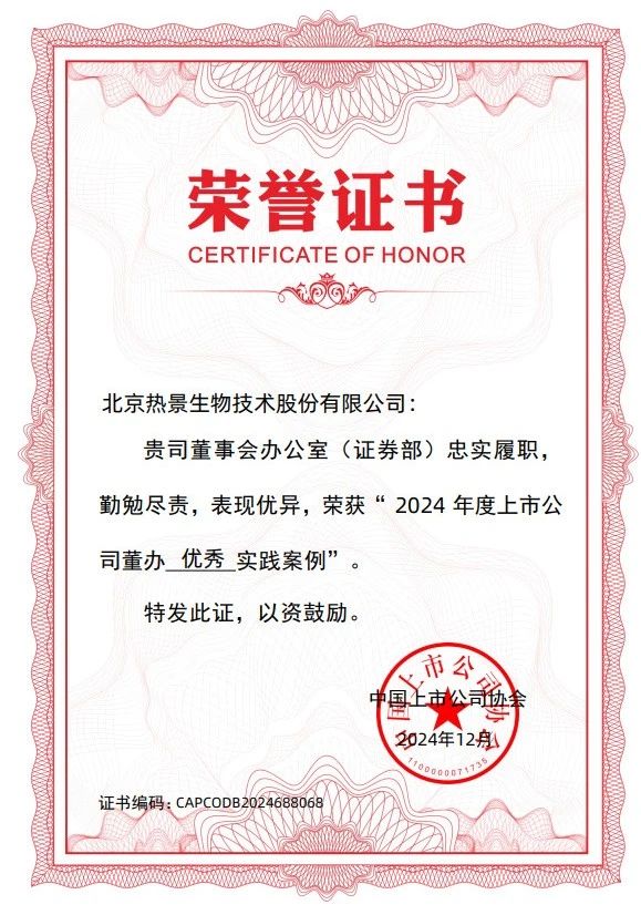 近日,中國上市公司協(xié)會開展的“上市公司董辦最佳實踐案例征集活動”結(jié)果揭曉,熱景生物榮獲“2024年度上市公司董辦優(yōu)秀實踐案例”,這也是公司連續(xù)第三年獲此榮譽。 “上市公司董辦最佳實踐”案例征集活動是中國上市公司協(xié)會對上市公司董事會辦公室履職情況進(jìn)行評價,評價體系涵蓋了上市公司董辦工作所涉及的信息披露管理事務(wù)、公司治理機制建設(shè)、投資者關(guān)系管理事務(wù)等指標(biāo),于今年10月啟動,經(jīng)初審、專家委員會評審、誠信核查等環(huán)節(jié),最終評出最佳實踐案例280家、優(yōu)秀實踐案例300家。其中入選“董辦優(yōu)秀實踐案例”的300家上市公司中,滬市上市公司150家,占50%;深市上市公司146家,占48.7%;北交所上市公司4家。