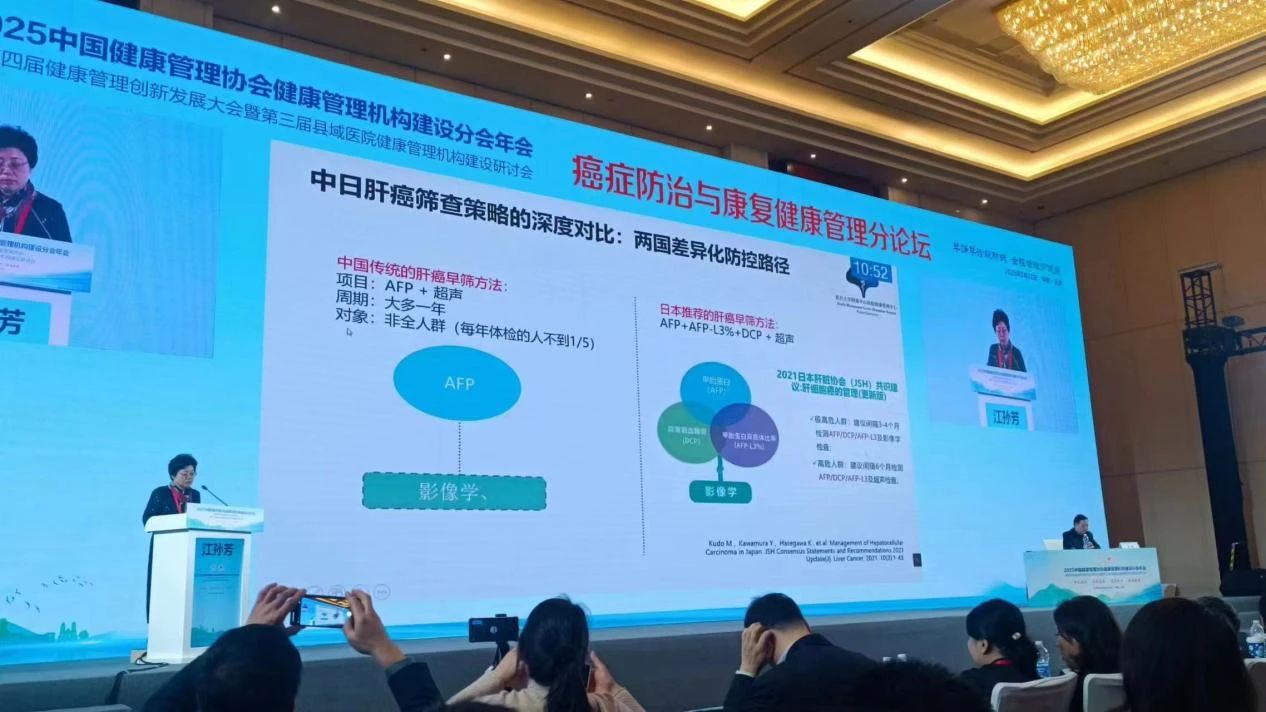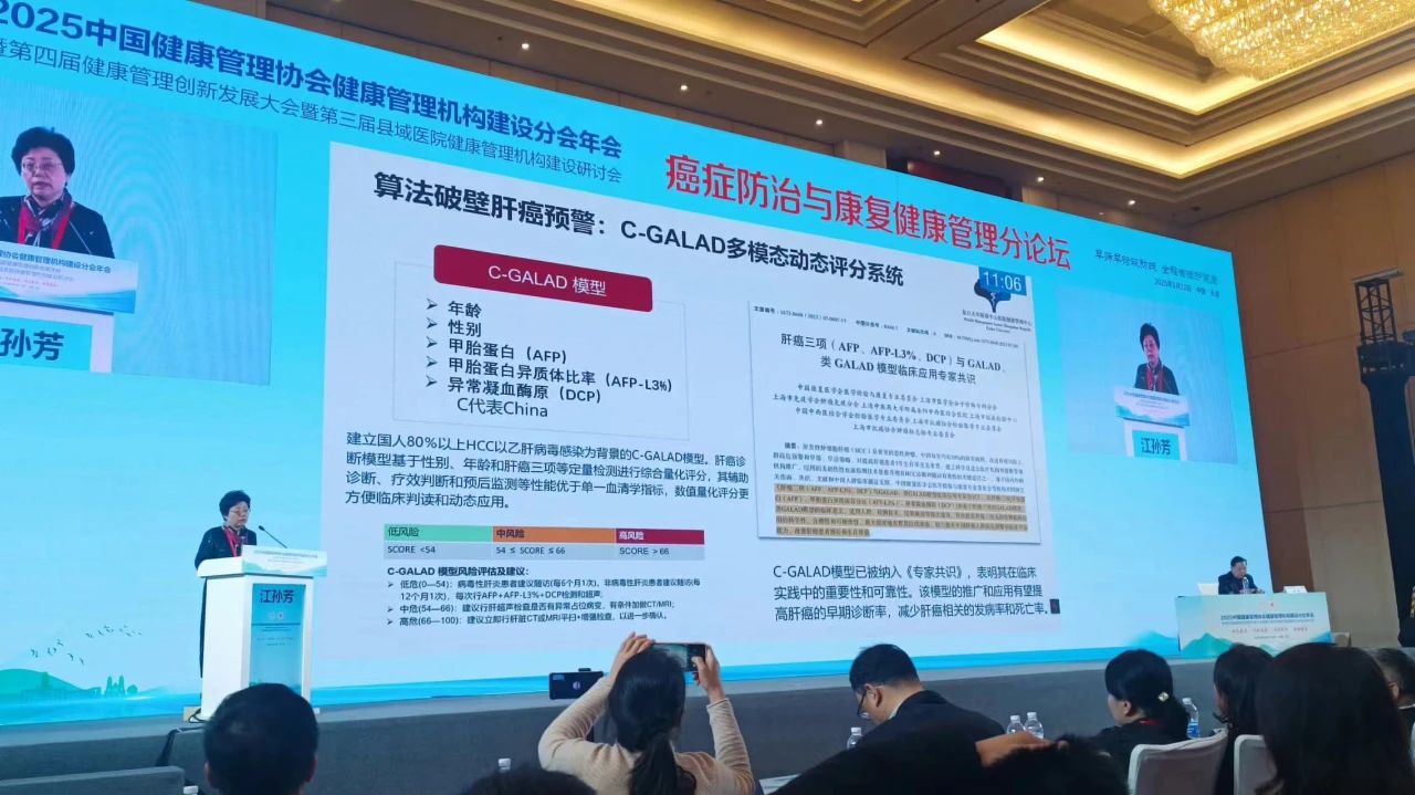 在《癌癥防治與康復(fù)健康管理》專(zhuān)項(xiàng)論壇中,復(fù)旦大學(xué)附屬中山醫(yī)院江孫芳主任受邀發(fā)表專(zhuān)題報(bào)告《健康管理中心-社區(qū)聯(lián)動(dòng) 助力肝癌早篩》,從臨床實(shí)踐與科研結(jié)合的角度,系統(tǒng)闡述了C-GALAD模型在肝癌早期篩查中的創(chuàng)新應(yīng)用價(jià)值。