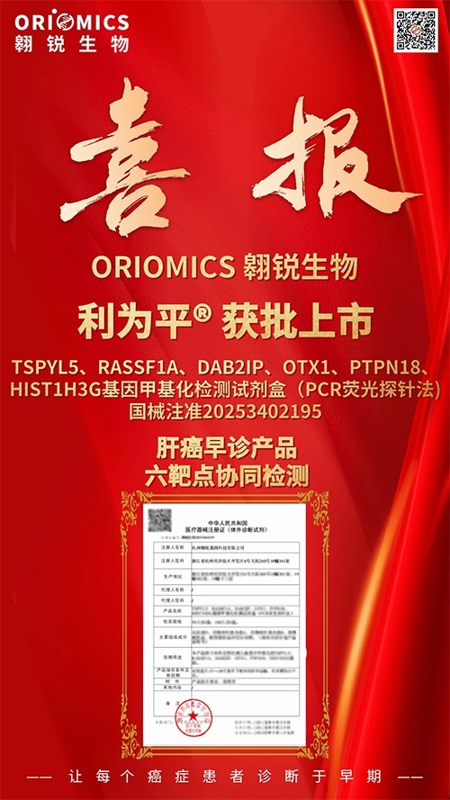 近日,熱景生物重要參股公司翱銳生物自主研發(fā)的利為平?——TSPYL5、RASSF1A、DAB2IP、OTX1、PTPN18、HIST1H3G基因肝癌甲基化檢測(cè)試劑盒(PCR熒光探針法)獲得國家藥品監(jiān)督管理局頒發(fā)的Ⅲ類醫(yī)療器械注冊(cè)證(注冊(cè)證號(hào):國械注準(zhǔn)20253402195)。該產(chǎn)品用于體外定性檢測(cè)人血漿中相關(guān)基因甲基化,適用于臨床上對(duì)疑似原發(fā)性肝癌的輔助診斷。